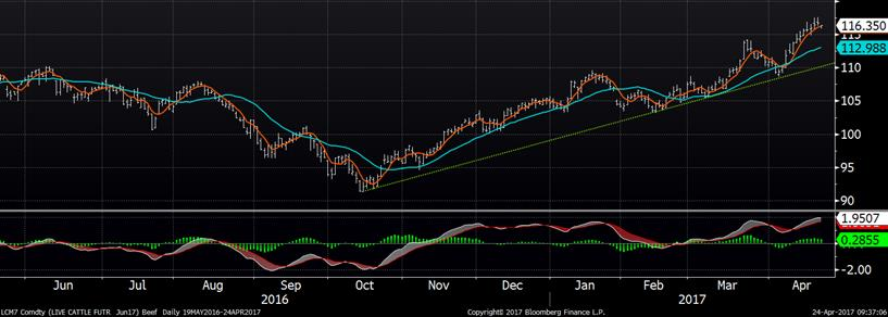 Les abattages de porcs continuent de surpasser la quantité de l’an dernier avec 2.29 millions de têtes ce qui est 2.4% de plus que l’an dernier. Le poids est tout juste sous le niveau de l’an dernier et la production a atteint 486.5 millions de livres ce qui représente une progression de 3.0% versus l’an dernier. Entre le 12 et 18 avril, les spéculateurs ont vendu un total de 6 440 CàT pour diminuer leur position long à seulement 18 000 CàT. De plus, pour la période du 19 au 25 avril, ça ne serait pas surprenant que la liquidation ait continué.