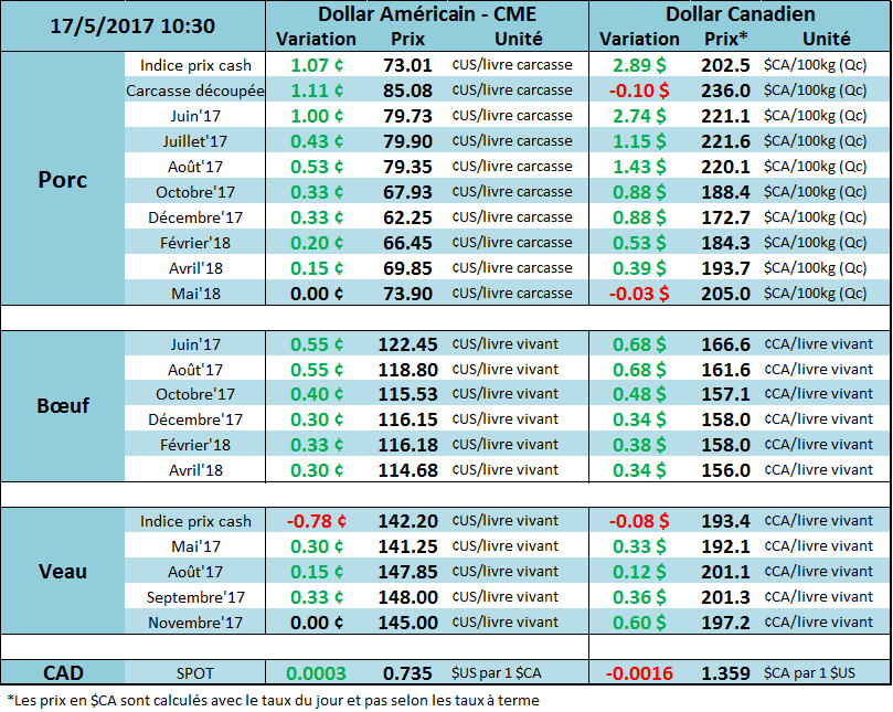 Le marché du porc a continué son ascension printanière grâce à un prix cash et des découpes qui ne cessent de s’apprécier. Pour la journée du 15 mai, le prix cash était de 73.74 ¢/lb, en hausse de 1.33 ¢/lb, ce qui confirme que la tendance ne ralentie pas pour le moment et donne un élan au CàT de juin. En plus de fermer à son plus haut niveau depuis 2 mois, le CàT de juin a ouvert ce matin avec un « gap » haussier et est présentement nez-à-nez avec la résistance et niveau psychologique du 80 ¢/lb. Si on perce ce niveau, ça serait un signal d’achat et pour cette raison, on préfère attendre avant de faire des ventes de porc pour 2017. Cependant, une stratégie possible afin de profiter du faible dollar canadien serait de fermer des CàT de CAD pour septembre et décembre, et laisser monter le prix des CàT de porc avec un objectif autour de 195 $CA/lb sur octobre et 180 $CA/lb sur décembre.