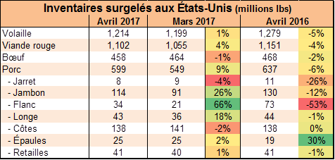 En avril, les inventaires de porc se sont reconstruits ce qui n’est pas une surprise avec la baisse du prix cash durant cette période. Les inventaires surgelés sont de 599 millions lbs au 30 avril ce qui est 50 millions de plus qu’en mars et on n’est que 6% sous les niveaux de l’an dernier, comparativement à -10.5% en mars. Les inventaires de bacon ont bondi de 66% depuis mars, à 34 millions de lbs, ce qui représente à peine la moitié des réserves de l’an dernier. On commencera donc la saison estivale avec des faibles inventaires de bacon ce qui pourrait faire considérablement augmenter les prix d’ici quelques semaines lorsque la demande sera forte. Les inventaires de longe ont aussi connu une forte progression passant de 36 à 43 millions de lbs, de retour au volume de 2016.
