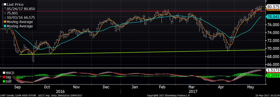 Dans le marché du porc, on constate que la demande est très forte malgré l’abondance de viande. La valeur de la carcasse découpée est de retour au plus haut niveau depuis juillet 2016 et à seulement 1¢/lb d’un sommet en 30 mois (décembre 2014). Bien que la force du marché des découpes ne se reflète pas totalement dans le marché cash lequel stagne à 76 ¢/lb depuis quelques jours, le marché appréhende un gain de 5¢/lb au cours des 3 prochaines semaines afin d’aller rejoindre le CàT de juin qui est à 80.95 ¢/lb. C’est la première fois cette année que tous les contrats d’été ont terminé la journée au-dessus de la barre du 80 ¢/lb.