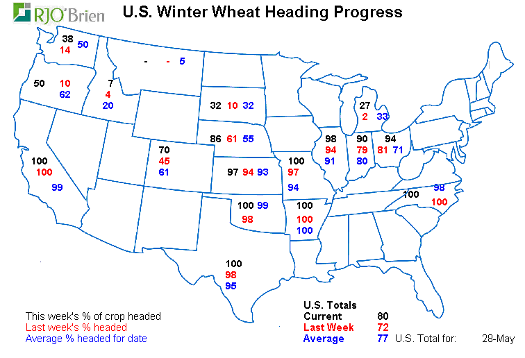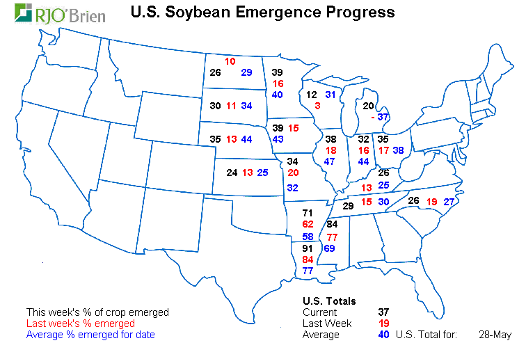 La condition nationale U.S. du blé d’inde est évaluée à 65% bon/excellent, soit le plus faible score depuis des années et nettement sous l’indice à pareille date l’an dernier (72%). Coté semis on est rendu à 91% en ligne avec les moyennes et les attentes. La météo cette semaine dans l’est du cornbelt sera plus clémente et devrait permettre le travail au champ. Le plus pertinent à retenir sur les conditions dans le maïs c’est que la corrélation entre la donnée d’aujourd’hui et le rendement final à l’automne est très faible, voire nulle. Le blé d’inde pourrait être très beau comme en 2012 et finir avec le pire rendement en plus d’une génération….