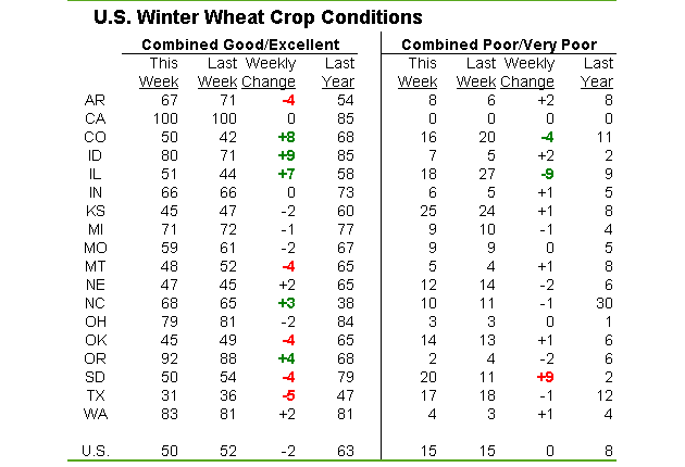 · Blé hiver : condition à 50% bon/excellent vs 52% semaine dernière et 63% l’an dernier