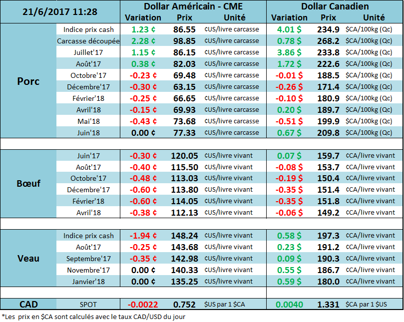Le prix du porc a été propulsé à la hausse grâce à la force du prix cash hier, ainsi que les découpes qui touchent un nouveau sommet. Juillet a fini la journée avec un hausse de 1.10¢/lb à 85¢/lb et c’est qui a permis de conclure un nouveau sommet. L’échéance d’octobre a vu touché un nouveau sommet en terminant la journée avec un hausse de +0.33¢/lb à 81.65¢/lb. Le prix cash continuent d’augmenter à une cadence « grand V », l’indice CME cash augmentera à 88.03 ¢/lb demain matin (+1.47 ¢/lb) pour atteindre un sommet de 2 ans et demi. Cela donnera un prix de 237.70 $CA/100kg. Pendant ce temps, la valeur de découpe de la carcasse de porc a bondi de 2.28 ¢/lb, avec un gain de + 6 ¢ sur le bacon.