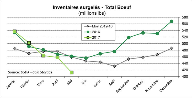 · Inventaires surgelés de bœuf : 11% de moins qu’en mai 2016 à 413 M lbs
