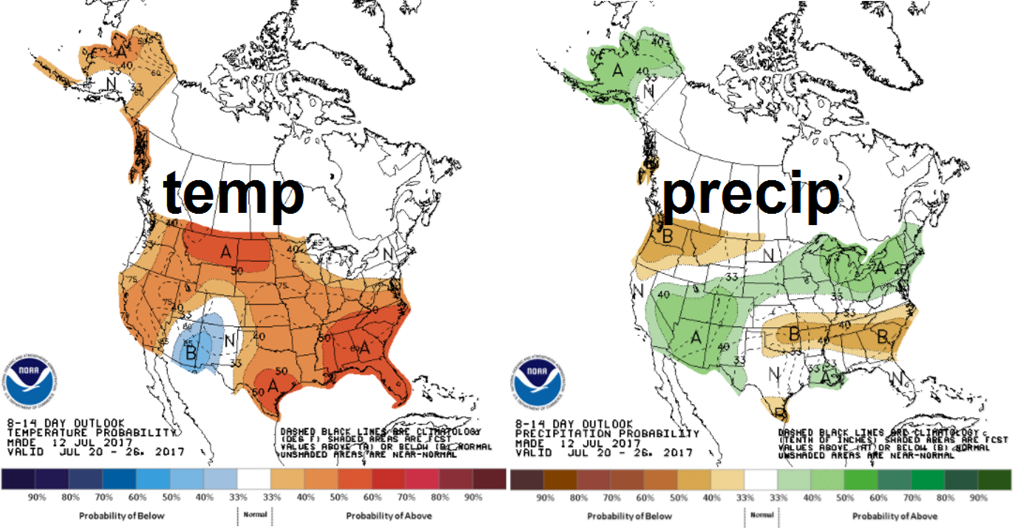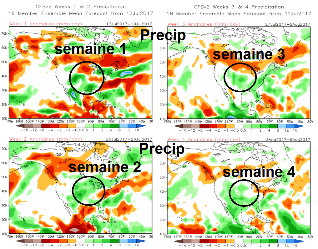 En fait, comme je viens de le mentionner, plein de raisons peuvent expliquer la baisse sévère qu’on observe et c’est la chimie du CBOT qui a parlé aujourd’hui. Après tout nous sommes à l’été et la nervosité du marché est à son sommet. Le rallye des deux dernières semaines est intimement lié aux cartes météos et à la possibilité de voir un rendement plus faible à cause de la chaleur et du manque d’eau. On a donc retiré un élément important : c’est la fin de la canicule et de la météo apocalyptique. Quand le marché voit « chaud et sec » dans le forecast, naturellement les prix s’ajustent. C’est un peu comme un signal d’alarme : au début il y a une petite lumière qui s’allume, après ça peut faire beep beep, ensuite le son devient plus fort, puis plus fort, à un certain moment donnée ça sonne ca vibre ca flash il est rendu trop tard et le dommage est fait. C’est ça qui s’est passé selon moi : les cartes météos ont montré de la chaleur et du temps sec. Par contre c’est l’été, il ne faut pas trop s’étonner si une canicule passe. C’est normal. La difficulté c’est qu’on ne sait pas combien de temps elle va s’installer et comment chaud il va faire. C’est le premier signe, le beep-beep qui a poussé les prix à la hausse dernièrement.