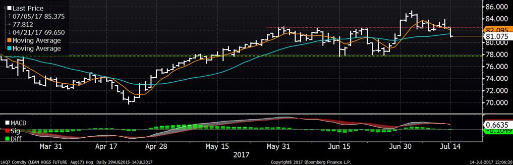 Les CàT de bœuf a ouvert hier en hausse et ils ont augmenté à leur plus haut niveau en 2 semaines mais n’ont pas pu maintenir les gains jusqu’à la fermeture. Tout de même, le prix a preservé les gains de +3 ¢/lb de mercredi dernier. L’échéance d’août a diminué -0.45¢/lb à 117.425, tandis que le mois d’octobre a fermé inchangé à 117.825 et décembre a diminué de -0.10¢/lb à 118.225. Les prix des coupes continuent à tomber, suivant la tendance des dernières années. Selon le rapport Boxed Beef le Choice a baissé -2.84¢/lb et le Select-1.47¢/lb. D’un point de vue technique, le support à 113.5 ¢/lb sur août résiste et représente le risque d’une contraction à court terme versus une 1ère résistance à 119 ¢/lb et une 2ème à 128 ¢/lb (voir graphique).