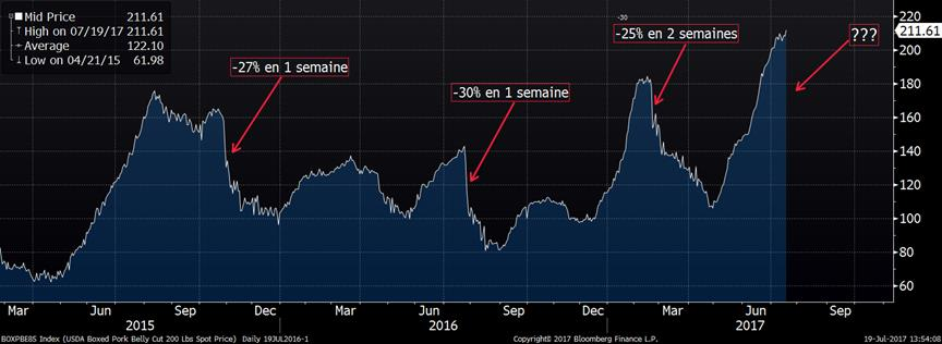 De plus, la découpe reste élevée à 105.25 ¢/lb ce matin, principalement grâce au bacon qui atteint un record historique à 212 ¢/lb. Cependant, c’est ce qui rend le prix du porc vulnérable d’une sévère correction ces prochains semaines et peut expliquer en partie l’énorme écart entre le cash et les CàT. Présentement, le prix des découpes est 13 ¢/lb de plus que l’an dernier et sur cette augmentation, il y a 11 ¢/lb qui est attribuable au prix du bacon (voir image). Historiquement, il y a délai d’environ 6 semaines avant que la variation du prix du bacon se reflète sur les prix en épicerie et nous sommes sur le point de voir le prix monter sur les tablettes (vite, faites vos réserves!). Cela pourrait impacter négativement la demande de bacon au cours des prochaines semaines et comme nous l’avons déjà vu dans le passé, la valeur du flanc peut reculer très rapidement. Par exemple, en octobre 2015 : -27% en 1 semaine, en juillet 2016 : -30% en 1 semaine et cette année en février : -25% en 2 semaines. Il y a donc un réel risque de voir le prix des découpes reculer subitement lorsque les prix du bacon auront augmenté en épicerie.