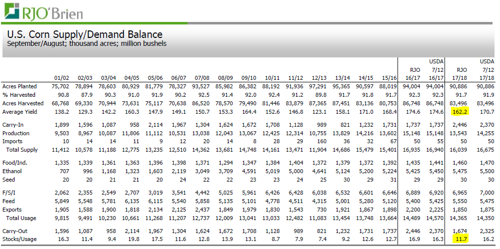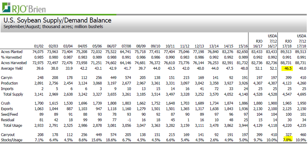 RJO prévoit un rendement de 162.2 boisseau/acre ce qui est nettement sous la tendance long terme de 170.7 b/a et du rendement de l’été dernier à 174.6 b/a. Cependant, la majorité des firmes parlent d’un rendement entre 165 et 170 b/a, on s’attend pour dire que le rendement sera entre 3% et 5% plus faible que l’an dernier. À cela s’additionne la baisse des surfaces ce qui devrait donner une production de 13.54 milliards de boisseaux selon RJO, comparativement à 15.15 milliards l’an dernier. De façon générale, la production devrait être 5% à 10% plus faible que l’an dernier dépendamment des firmes sondées.
