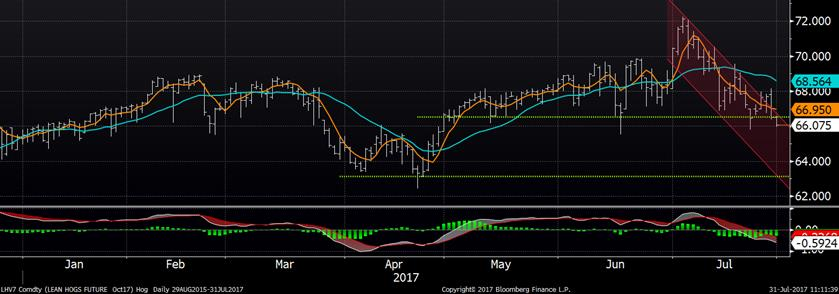 La production hebdomadaire était de 464 millions lbs en hausse de seulement +2.0% par rapport l’an dernier. Cette production provient de l’abattage de 2.24 millions porcs (+2.1% vs 2016) et d’un poids carcasse à 207 lbs. Chez les spéculateurs, du 19 au 25 juillet, ils ont vendu un net de 2,600 CàT pour réduire leur position à 77,300 CàT d’achetés. Leur position représente 24% de tous les CàT existants ce qui est près du record de 27%, il y a donc un risque que les spéculateurs liquident leur massive position au cours des prochains mois sous la pression saisonnière.