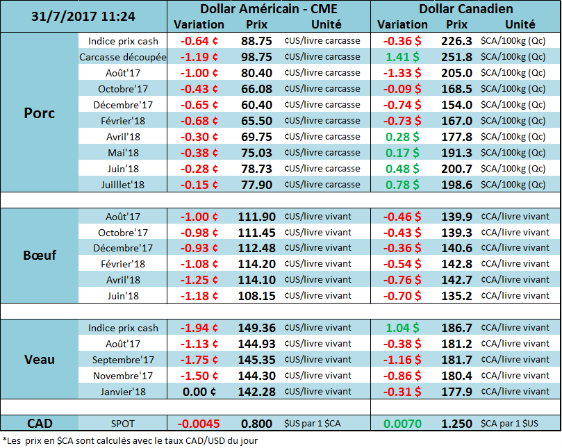 La semaine dernière, les abattages étaient de 627,000 têtes en hausse de 5,000 bœufs par rapport la semaine précédente (+0.8%) et 47,000 têtes de plus que l’an dernier (+8.1%). Le poids reste une vingtaine de livres en-dessous de celui de l’an dernier, présentement à 1331 lbs/vivant ou 807 lbs/carcasse. Somme toute, la production hebdomadaire s’établit à 505 millions lbs, en hausse de +0.9% et +5.7% par rapport la semaine précédente et l’année dernière respectivement. Du côté des spéculateurs, entre le 19 et 25 juillet, ils ont vendu un total de 2593 CàT pour réduire leur position à 100,700 CàT d’achetés. D’août 2015 à novembre 2016, la moyenne des positions des spéculateurs était de 30,000 CàT d’achetés, il y a donc de la place pour que les spéculateurs liquident leur position si une tendance baissière s’amorce.