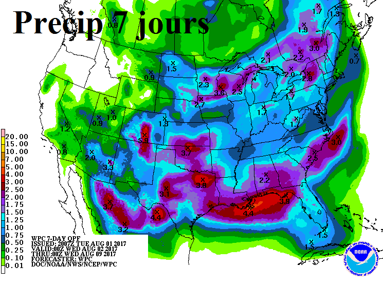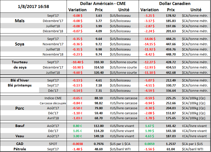 On pourrait dire que c’est Turnaround Tuesday, que les fonds ont vendu des contrats et que cela a eu un impact sur l’ensemble des marchés. Je trouve que c’est souvent une raison utilisée à outrance pour tenter d’expliquer chaque mouvement, à chaque jour. Nous sommes à une période de l’année très volatile ou chaque jour on doit recalculer l’offre-demande afin d’évaluer les inventaires de fin. Le rapport sur la condition des cultures hier soir donnait l’information comme quoi la situation dans le soja s’améliore. En plus les cartes météo pointe vers des conditions plus clémente pour le remplissage des gousses; précipitations et absence de chaleur accablante. Est-ce que ça veut absolument dire que la récolte est faite et qu’elle sera abondante? Non. Ça veut juste dire qu’en ce moment les chances qu’elle se dégrade significativement dans les prochaines semaines sont plus faibles.