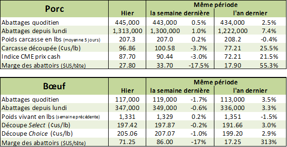 Le prix cash est apparu à 116-17 $ au Kansas, à une cent inférieur à celui de la semaine dernière, alors que le Nebraska a monté à 118 $, en hausse de dollar par rapport à la semaine dernière. Dans l’encan électronique de Fed Cattle Exchange de hier, il a eu seulement la vente de 54 têtes versus l’offre de 1063 têtes déclarées au Nebraska, pour un prix cash moyen de 116.00 ¢/lb. Le rapport Boxed Beef a montré le Choice en baisse de -0.35 cents et le Select en baisse de -0.87 cents. La marge des abattoirs selon HedgersEdge restent robustes à environ 71$USD/tête en ligne avec hier et il y a une semaine. Les solides marges contribuent à soutenir les prix cash.