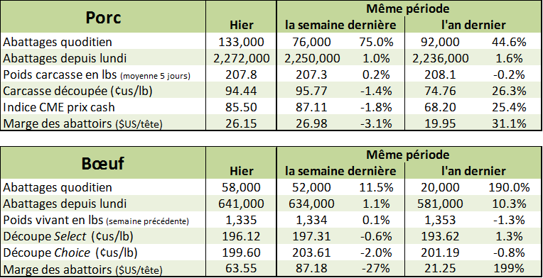 Jeudi, l’USDA a mis à jour le bilan offre et demande du marché porcin. Du côté de la production, il n’y a pratiquement pas de changement, sauf un retranchement de 30 millions lbs dans la production du 3èmetrimestre. On s’attend toujours à ce que la production du 4ème trimestre touche la barre du 7 milliards de livres ce qui représenterait une augmentation de 5.3%. D’où l’importance à ce que l’échéancier des ouvertures d’abattoir ne soit pas trop retardé puisqu’on devrait avoir des semaines de production à 2.5 millions lbs, voir 2.6 millions lbs. Du côté des projections de prix, l’USDA a considérablement augmenté la fourchette pour le 3ème trimestre de 51-53 ¢/lb vivant à 57-59 ¢/lb (prix moyen à 76 ¢/lb carcasse). Pour le 4ème trimestre, l’USDA a monté le prix moyen par 2 ¢/lb vivant pour une valeur carcasse à 59 ¢/lb.