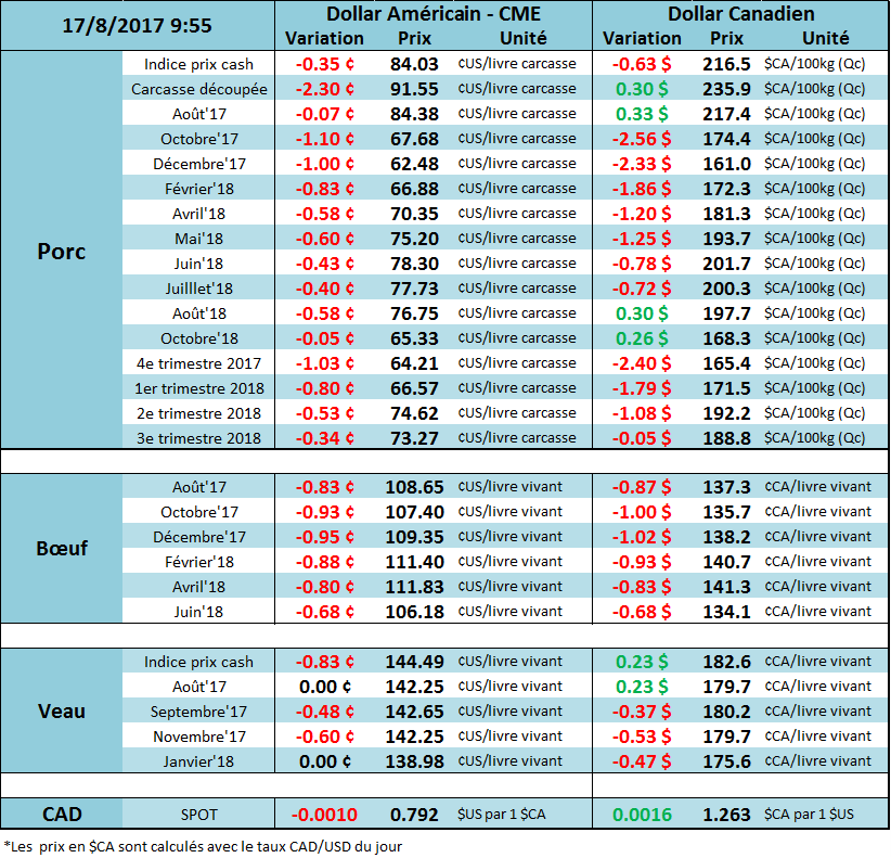 Hier à l’ouverture du marché, le prix d’octobre touchait un nouveau sommet à 71.325 ¢/lb et décembre à 65.35 ¢/lb. Cependant, le marché n’a pas tenu le coup et a brusquement changé de direction en raison de la chute du prix du bacon. La valeur de la carcasse découpée a chuté de -2.30 ¢/lb à 91.55 hier, mais la baisse est concentrée sur le flanc qui a chuté de -13.59 ¢/lb à 182.54. Une chute aussi drastique inquiète beaucoup pour les jours à venir. Si on se réfère aux années précédentes, une baisse importante de la valeur du bacon entamait la dépréciation saisonnière des découpes. Autrement dit, ça l’indique que la demande estivale tire à sa fin et c’est qui explique la faiblesse des prix des contrats en après-midi. Par moment, le contrat d’octobre affichait une baisse de 2.57 ¢/lb sur la journée, assez près du « limit down ». Au final, le prix du CàT d’octobre a terminé la séance à 68.78 (-1.75 ¢/lb) et sur décembre à 63.48 (-1.22). De plus, les abattages pour les 3 premiers jours de la semaine se situent à +3.25% par rapport l’an dernier. L’offre de viande pourrait donc retourner vers les prévisions de l’USDA, contrairement à ce qu’on a vu la semaine dernière.