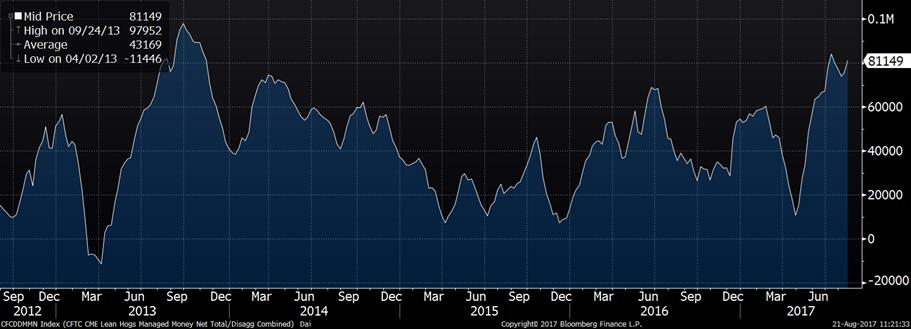 Du 9 au 15 août, les spéculateurs ont augmenté leur position par 5663 CàT juste avant la chute du prix. Leur position totalise 81,149 CàT ce qui correspond à une important position, la deuxième plus élevée depuis novembre 2013… et oui, la position actuelle des spéculateurs est plus importante que celle durant la crise DEP. Cependant, d’un point de vue monétaire, elle est plus faible puisque la valeur des contrats de porc en environ la moitié (26,000 $US) de ce qu’elle était en 2014. Tout de même, cette imposante position pourrait mettre de la pression sur les prix s’ils se mettent à liquider.