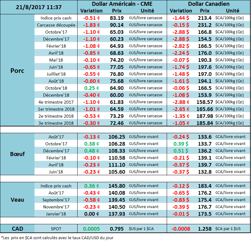 Pour la troisième semaine d’août, les abattages de porc étaient seulement à 2.33 millions têtes ce qui est à peine 1.6% plus élevée que l’an dernier. Le poids moyen des carcasses est de 207 lbs, en ligne avec l’an dernier. La production était donc de 482 millions lbs en hausse de 2.6% et 1.5% par rapport la semaine précédente et l’an dernier respectivement. L’offre de porc continue d’être nettement sous les prévisions du 3ème trimestre de +2.6% par rapport le même trimestre en 2016. Cependant, la production de 7 milliards de livres anticipée pour le 4èmetrimestre représentera +5.3% de la production de l’an dernier, en même temps que la production de bœuf sera +8.2% de celle du 4èmetrimestre 2016. Cette abondance explique l’écart élevé entre le prix cash versus ceux d’octobre et décembre.