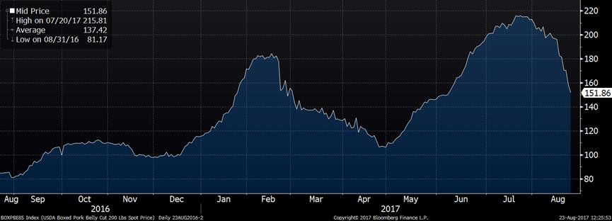Au 31 juillet, les inventaires surgelés étaient de 556 millions lbs, c’est légèrement sous la moyenne 5 ans et 7% sous la quantité de juillet 2016. Les inventaires de flanc ont diminué de 4 millions lbs et l’énorme déficit qu’on avait avec la normale se rétrécie. Aussi, les inventaires de retailles sont à leur plus faible niveau depuis septembre 2010 à 29.9 millions livres. La petitesse des stocks de bacon et des retailles démontre bien la forte demande pour les coupes plus grasse.