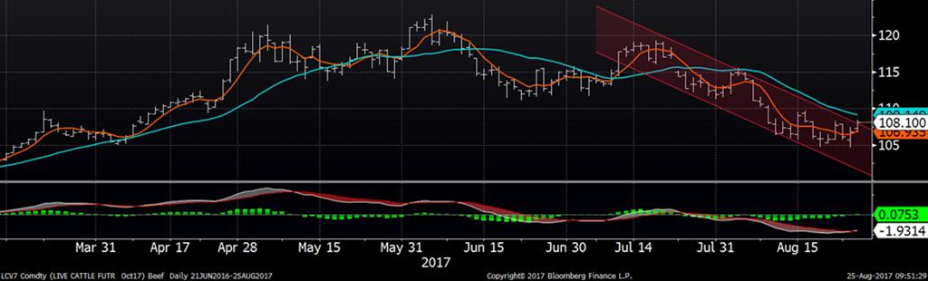 Un peu comme le marché du porc, le contrat de bœuf sur octobre a touché un nouveau creux hier (104.625 ¢/lb) avant de terminer la journée dans le vert. Cette semaine, le prix semble chercher à se stabiliser entre 105 et 108 ¢/lb sur octobre, en attente du rapport Cattle-on-Feed de cet après-midi à 15h00. La moyenne des estimés est de 104.9% de bœuf en parc au 1er août avec des placements à 106.2% et commercialisation à 104.5% en juillet. Hier, l’USDA rapportait des ventes de 15,000 têtes au Nebraska mercredi, avec une moyenne de prix juste en-dessous de 107 ¢/lb vivant. Ça représente une baisse de 3 ¢/lb par rapport la semaine dernière. La valeur des découpes baisse de -0.58 à 191.75 ¢/lb pour le Choice et de -0.81 à 188.6 ¢/lb pour le Select.