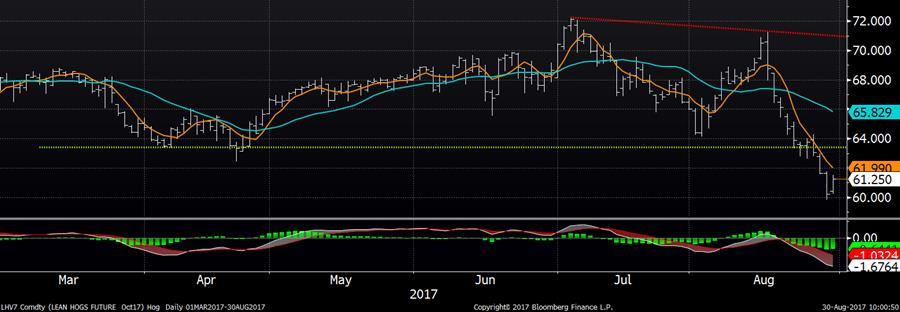 Le prix du bœuf a reculé de 2.2 ¢/lb hier pour les livraisons d’octobre et décembre, effaçant les gains des 2 séances précédentes. L’USDA a rapporté des ventes de 1891 têtes au Nebraska à la mi-journée à 168 ¢/lb carcasse ce qui correspond à une baisse de 2 ¢/lb par rapport la semaine dernière. On n’a donc pas réussi à sortir du canal baissier, il aurait fallu terminer dans le positif pour confirmer la fin de cette tendance. Le marché baisse un peu ce matin, d’environ une demi cent, on retourne tester le support de 105.5 ¢/lb sur octobre. Depuis le début de la semaine, les abattages sont de 233 000 têtes, seulement 3000 têtes de moins que la semaine dernière. L’impact d’Harvey ne semble finalement pas majeur sur les opérations d’abattage. Hier, le prix des découpes montaient de +2.17 à 190.79 ¢/lb pour le Select et de +0.27 à 191.77 ¢/lb pour le Choice.