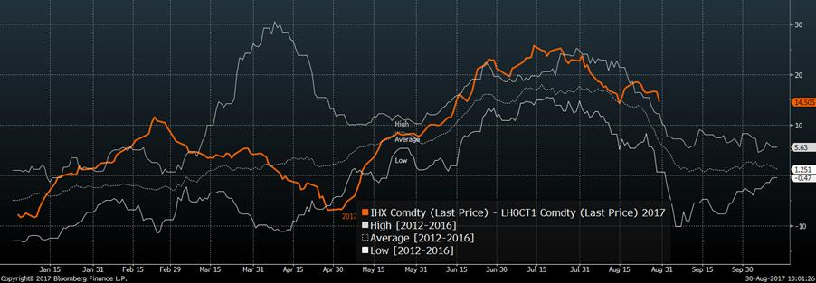 Hier, le prix du porc a connu une autre sévère correction. L’échéance d’octobre a passé sous la barre du 60 ¢/lb pendant la journée pour terminer à 60.23 (-1.40) alors que décembre a fini la séance à 56.15 ¢/lb (-1.42) et février à 60.90 (-1.57). Il n’y pas de nouvelles fraiches sur le marché du porc, le prix continue de subir la pression saisonnière. Cependant, le marché est d’avantage pessimiste qu’à la normale, l’écart entre le CàT d’octobre et le cash est de 14.5 ¢/lb, c’est pratiquement un record comme écart de prix à cette période de l’année. Autrement dit, le marché anticipe déjà une baisse du cash de 38 $CA/100kg d’ici 6 semaines. Cependant, ce n’est pas irréalisable puisque l’an dernier, le prix cash avait baissé de presque 14 ¢/lb durant ces 6 semaines… et nous étions déjà une dizaine de cents en dessous des niveaux actuels.