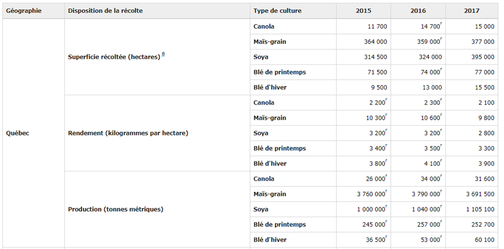 Via Statistiques Canada, Estimations des principales grandes cultures basées sur des modèles, 2017 (pour plus d’info, notamment sur le blé)