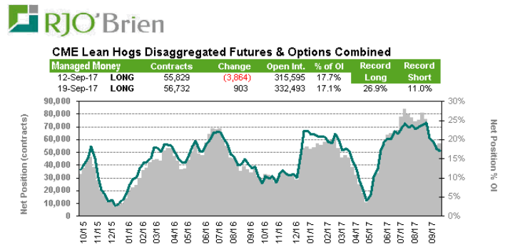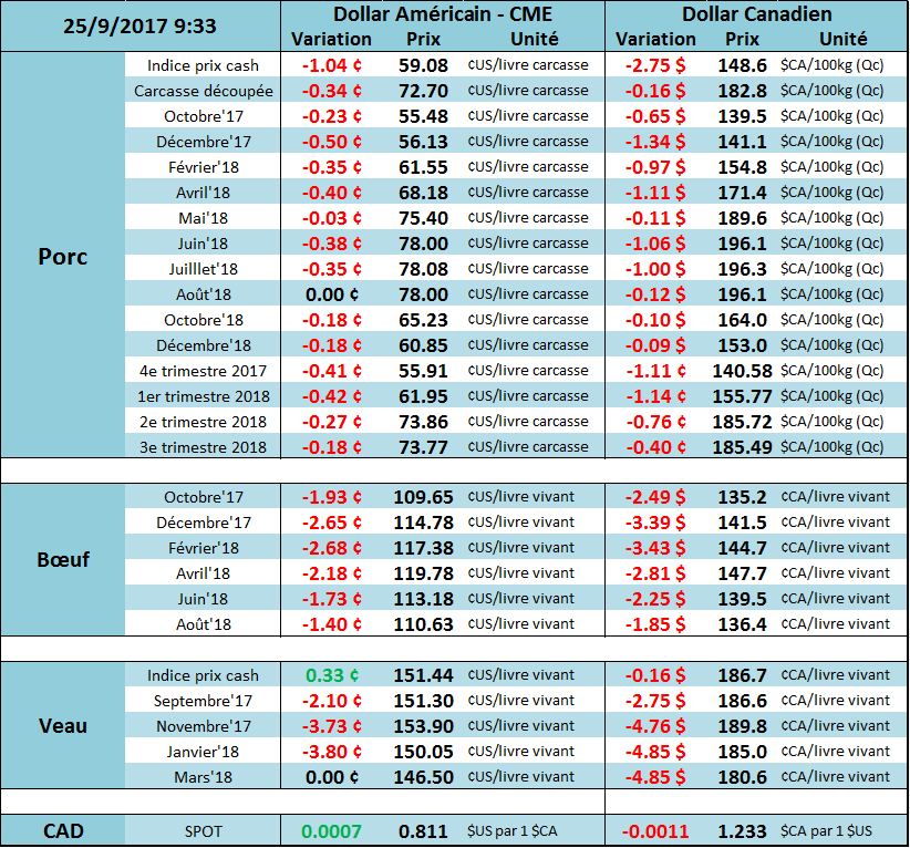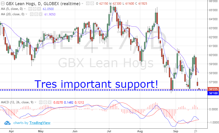 Avec le marché dans une tendance baissière très forte (contrat d’octobre), c’est assez étonnant de voir les fonds conserver une position longue de 56K contrats et options. Le rapport Cold Storage qui nous renseigne sur les inventaires surgelés est considéré comme bearish pour les prix. Les stocks de porc à la fin aout sont évalués à 575.7 millions de livres, en baisse de 5.5% versus 2016 mais en hausse de 3.8% versus le mois d’avant. Habituellement les stocks augmentent beaucoup moins que 3.8% à cette période, d’où la conclusion d’un rapport négatif pour les prix. À mon avis le rapport Quaterly Hogs and Pigs plus tard cette semaine est fichtrement plus important que le cold storage. Vendredi le contrat d’octobre à ouvert à la baisse avec un « gap » et a même clôturé près des bas de la journée à 55.70. La dégringolade de la valeur de la découpe a fortement contribué au déclin des prix des contrats à terme. La découpe est à 72.26$ comparativement à 77.36 la semaine dernière et représente la plus faible valeur depuis le 17 novembre de l’an passé.
