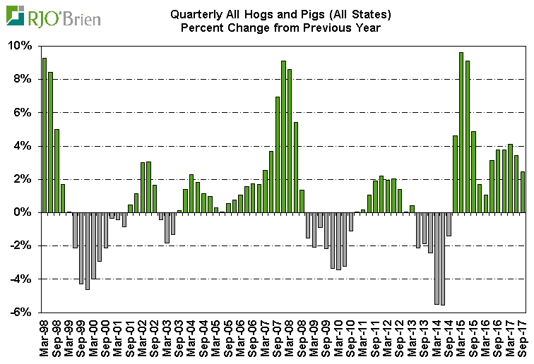 Le rapport est sommes toutes neutre par rapport aux prévisions alors que les inventaires sont évalués à 73.55 millions, en hausse de 2.5% versus 2016. Le cheptel reproducteur à 6.09 millions, en progression de 1.2% et lui aussi directement en ligne avec la moyenne des estimés. De manière générale le rapport est neutre et confirme les attentes de l’industrie à savoir que l’expansion du secteur se poursuit de manière ordonnée.
