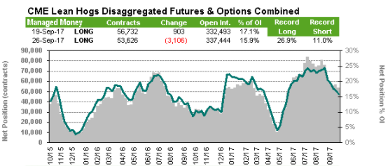 Graduellement, les spéculateurs redeviennent optimistes en augmentant leur position d’achat sur les contrats de bœuf. Entre le 20 et 26 septembre, ils ont acheté un net de 5,700 CàT ce qui amène leur position totale à 92,350 CàT.