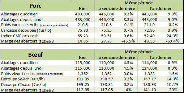 Bien que le marché du porc ait commencé la semaine en hausse, le marché a changé de direction pour terminer la journée avec une baisse de -1.32 ¢/lb sur décembre et -0.87 ¢/lb sur février. En considérant le volume abattu de 483,000 têtes, soit 37,000 de plus que lundi dernier, on peut s’attendre à ce que l’ascension du prix cash ait ralenti. Apparemment, la faiblesse des abattages de la semaine dernière proviendrait des éleveurs qui retenaient les animaux quelques jours puisque le prix grimpait constamment. Si c’est le cas, on peut s’attendre à un retour du balancier cette semaine avec des volumes plus importants.