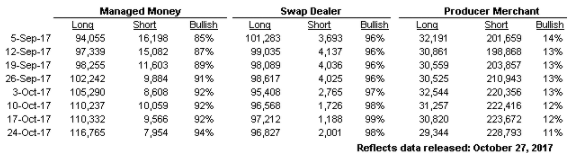 Entre le 18 et 24 octobre, les spéculateurs ont acheté un total de 2,331 CàT portant leur position nette à 64,600 CàT d’achetés. Inversement, les éleveurs ont vendu 2,408 CàT portant leur position nette à 105,592 CàT vendus.