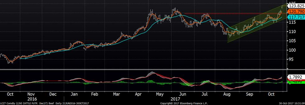 Le marché du bœuf est très fort ce matin, ouvrant avec un gap à la hausse, avec le CàT d’octobre à +4.9 ¢/lb et le CàT de décembre à +3.0 ¢/lb sur la limite maximale. La force d’aujourd’hui semble provenir en partie du prix cash avec le prix d’octobre qui explose malgré sa faible liquidité, ça reste tout de même une référence du marché cash. Aux dernières nouvelles, vendredi après-midi, les parcs d’engraissement demandaient 116-118 ¢/lb alors que les acheteurs offraient 111-112 ¢/lb. Apparemment que les acheteurs ont rectifié leur proposition… De plus, ce weekend, la Chine a levé l’interdiction d’importer des bœufs de l’Australie ce qui devrait faire augmenter le prix du bœuf sur la plus grosse île au monde si la Chine commence à acheter massivement. L’Australie est l’un des 3 principaux vendeurs de bovin aux États-Unis, donc une augmentation du prix en Australie diminuerait les achats de bœufs de l’étranger et par conséquent, pourrait faire diminuer l’offre américaine.