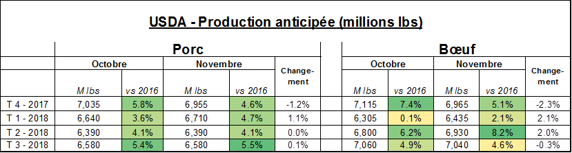 Dans son rapport mensuel, l’USDA a déplacé un peu de production de la fin de l’année 2017 vers le début 2018. L’USDA a diminué la production bovine par -150M lbs au 4ème trimestre et l’a augmenté par +130M lbs au 1er trimestre 2018. À cela s’ajoute une révision de +130 M lbs pour le 2ème trimestre 2018. En somme, l’USDA a revu la production à la hausse pour 2018 par 2.6% comparativement aux estimés d’octobre ce qui est légèrement compensé par une augmentation des exportations. Au final, il y aura 59.2 lbs de bœuf à consommer par américain en 2018, un sommet depuis 2010. C’est presque 2 lbs / habitant de plus qu’en 2017. Toutefois, l’USDA a revu sa moyenne de prix pour 2018 à la hausse de 2 ¢/lb même s’il y aura plus d’offre, avec une fourchette à 113 – 122 ¢/lb, comparativement à 121.80 ¢/lb en 2017.