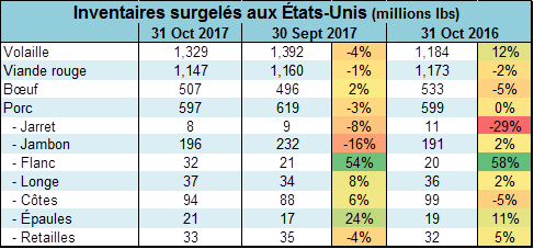 En date du 31 octobre, les inventaires surgelés de bœuf étaient de 507 millions lbs ce qui est 5% de moins que l’an dernier à pareille date, mais 16% de plus que la moyenne des 5 dernières années. On voit que les stocks suivent leur tendance saisonnière en augmentant progressivement entre juillet et décembre. En somme, les inventaires surgelés de viandes rouges étaient de 1.15 milliard lbs ce qui est très similaire aux 3 dernières années.