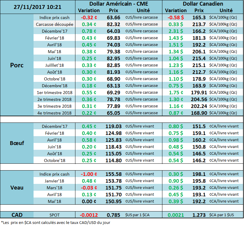 Le marché du porc a terminé la semaine en force, prolongeant le rallie de mercredi avec l’aide de la valeur de la carcasse découpée, des marges élevées pour les abattoirs ainsi que des signaux techniques d’achat. D’une part, les découpes retournent à leur plus haut niveau depuis le mois de septembre, à 82.32 ¢/lb, ce qui permet à l’écart entre la carasse entière et découpée d’élargir à 44 $US/tête. D’autre part, les prix ont amorcé une tendance haussière depuis une semaine et l’ouverture de vendredi a formé un « gap » ce qui vient démontre l’engouement des acheteurs. Cela s’est également reproduit ce matin avec une ouverture à la hausse de +0.5 ¢/lb sur décembre. Le contrat continue donc de grimper pour retourner à mi-chemin entre les hauts du 31 octobre (68 ¢/lb) et le bas de la mi-novembre (60 ¢/lb), présentement à 64 ¢/lb.