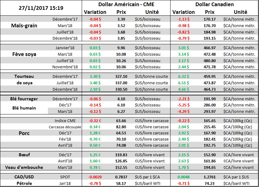 - Contrats de décembre (grain) : Premier jour de livraison jeudi.