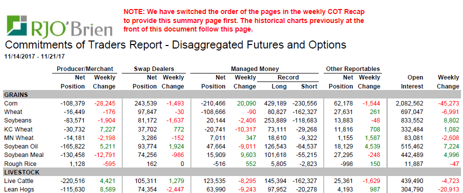 - Position spéculative CFTC : thématique court maïs/blé et long complexe soja.