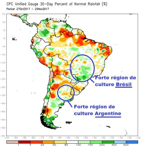 Amérique du Sud: la progression des semis n’est pas réellement un problème actuellement. En Argentine : 41% soja et 50% maïs dans les temps. Au Brésil : 71% soja et 81% maïs lui aussi dans les temps. Par contre les forecast météo ne sont pas les plus cléments pour les cultures; on parle de trop sec en Argentine pour les jeunes cultures qui émergent. Le dernier 30 jours en Argentine a connu de plus faible précipitations qu’à la normale et on attend que de faibles accumulations pour les 2 prochaines semaines. On est très loin d’une sécheresse, mais le marché veut être prudent, surtout pour le soja à cause de l’énorme programme d’export de tourteau (pratiquement la moitié du commerce mondial de tourteau vient de l’Argentine).