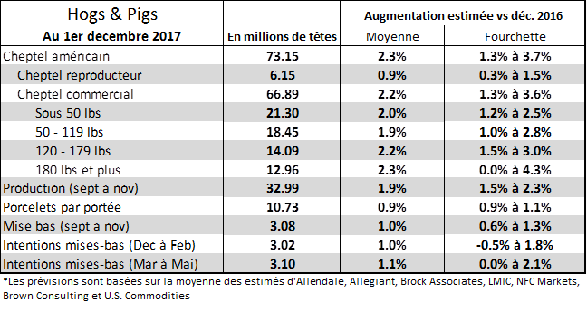 Concernant le cheptel reproducteur, la moyenne des estimés est à 6.15 millions de truies et cochettes ce qui correspond à une augmentation de 0.9% depuis le 1er décembre 2016 tandis que la fourchette des estimés est de +0.3% à 1.5%. C’est assez près de la croissance observée ces 3 dernières années à +1.2% par année. Évidemment, avec plus de truies, on s’attend à ce que la production continuera de croître durant la prochaine année.