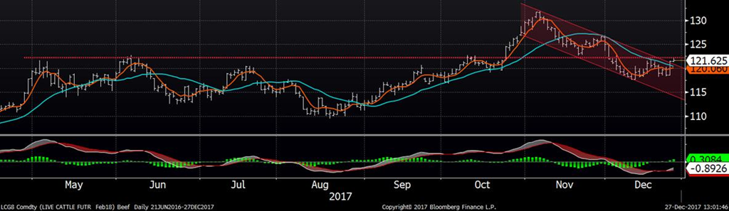 Après avoir diminué après la publication du Cattle-on-Feed de vendredi dernier, le prix des contrats de bœuf a rebondi hier. Malgré le fait qu’il y aura beaucoup de bœuf au 2ème trimestre, le prix du bœuf tente de sortir du canal baissier des 2 derniers mois. Une fermeture au-dessus de 122.50 ¢/lb sur février indiquerait que la tendance a réellement changé de direction, mais le marché se transige encore 1 ¢/lb en-dessous de ce niveau. La météo plus froide qu’à la normale pour l’est des États-Unis ainsi que des prévisions annonçant de la neige ces prochains jours sont des éléments qui viennent supporter le prix du bœuf à l’arrivé du nouvel an.