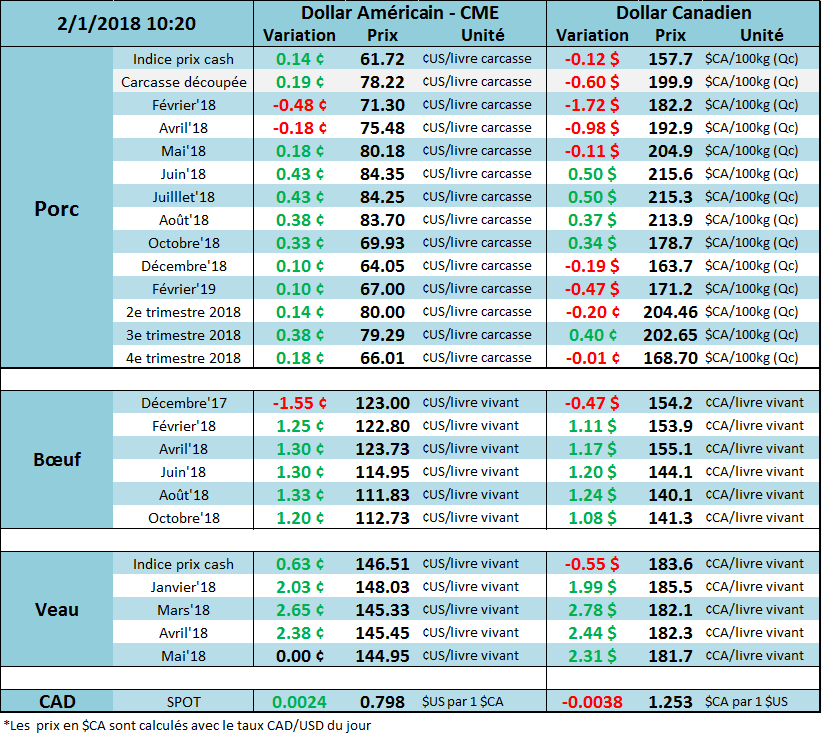 Le prix du bœuf commence l’année positivement avec un gain de 1.30 – 1.50 ¢/lb dépendamment des échéances. Un prix de fermeture au-dessus de 123 ¢/lb sur février confirmerait qu’on sort de la tendance baissière des 2 derniers mois, à surveiller de près mais ce qui est encourageant est de voir certains indicateurs (moyennes mobiles et MACD) qui pointent déjà vers une hausse à court terme. Le rebond d’aujourd’hui s’explique en partie grâce aux prévisions météo qui continuent de prévoir une température froide et sèche pour les plaines américaines au cours de la prochaine semaine (le blé d’hiver gagne 2% et le gaz naturel monte de 3%).
