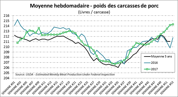 La semaine dernière, les abattages totalisaient 2.1 millions de porcs ce qui représente une augmentation de +1.9% versus la même semaine en 2016. De son côté, le poids a commencé à plafonner à 214.3 lbs/carcasse ce qui est 2.5 lbs de plus que l’an dernier. L’augmentation du poids fût impressionnante dans les dernières semaines avec un gain de 4 lbs/carcasse en seulement 8 semaines. On devrait donc débuter 2018 avec un poids oscillant autour de 214 lbs comparativement à 211.5 lbs l’an dernier ce qui gonflera l’augmentation de la production au cours des prochaines semaines. Somme toute, la production de la semaine dernière était de 451.6 millions lbs ce qui est 3.1% de plus que la dernière semaine de 2016. En 2017, les abattages totalisent 120.5 millions de têtes ce qui est 2.7% de plus qu’en 2016 tandis que le poids moyen était similaire ce qui porte la production de l’année à 25.44 milliards de livres (+2.6 %)