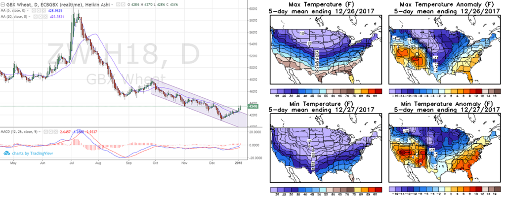 Blé: la vague de froid qu’on connait ici et aussi présente aux USA au moment où le couvert de neige n’est peut-être pas assez généreux. Le résultat des courses fait en sorte que le prix à la bourse a augmenté pour une autre journée consécutive. Le prix demeure relativement faible à 4.35 (CBOT mars) mais c’est tout de même un bon de 20 cents depuis la mi-décembre. Techniquement les courbes nous donnent certains indicateurs positifs pour le prix avec le croisement des moyennes mobiles, croisement MACD et aussi la sortie du canal baissier. Par contre ne vendez pas la peau de l’ours avant de l’avoir tué; je demeure très prudent d’un rallye météo à l’hiver…. Après tout c’est un blé d’hiver, en dormance, dans un contexte d’abondance et aussi, avant la parution des ensemencement/stock/WASDE de vendredi 12 janvier prochain. C’est un commencement de quelque chose, mais restons réaliste car la structures du marché via le carry (différence de prix entre mars et mai par exemple) montre un inventaire extrêmement confortable.