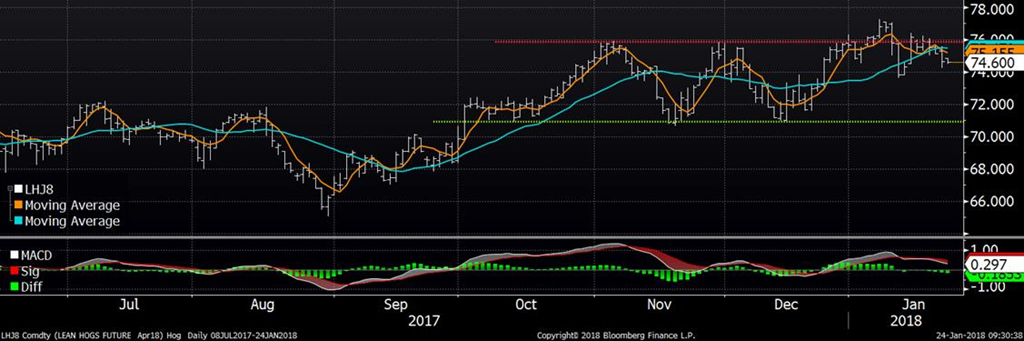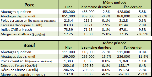 Le prix cash du bœuf est sans direction cette semaine, tandis que la valeur du Choice montait de +1.78 ¢/lb hier et le Select de +0.64 ¢/lb. L’écart entre les deux grades se maintient près de la moyenne des 5 dernières années à 5.55 ¢/lb. La tempête hivernale aux États-Unis aura eu pour effet de forcer la fermeture temporaire de certains abattoirs et de possiblement diminuer la prise de poids des troupeaux. Cette semaine, les abattages sont de 199,000 têtes, en baisse de 27 000 têtes versus l’an dernier.