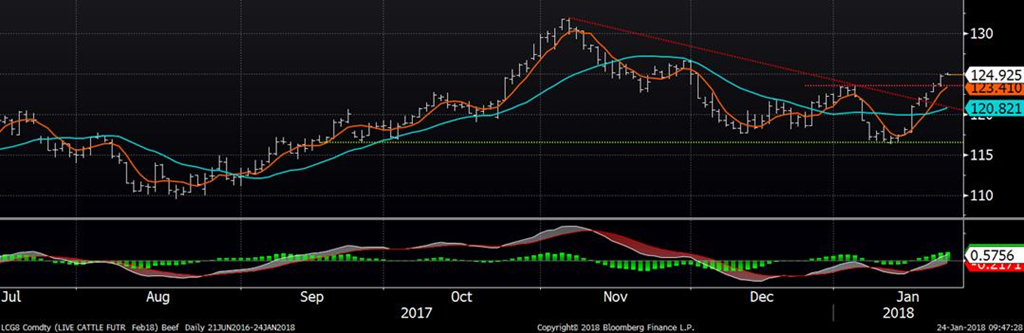 Hier, le prix du CàT de février a brisé des niveaux techniques important ce qui confirme la poursuite de la tendance haussière depuis le 12 janvier. Le prix a percé la résistance de 123.50 ¢/lb hier avec un gain de +1.17 ¢/lb. Ce matin, les prix sont plutôt sablent, variant entre -0.2 et +0.2 ¢/lb.