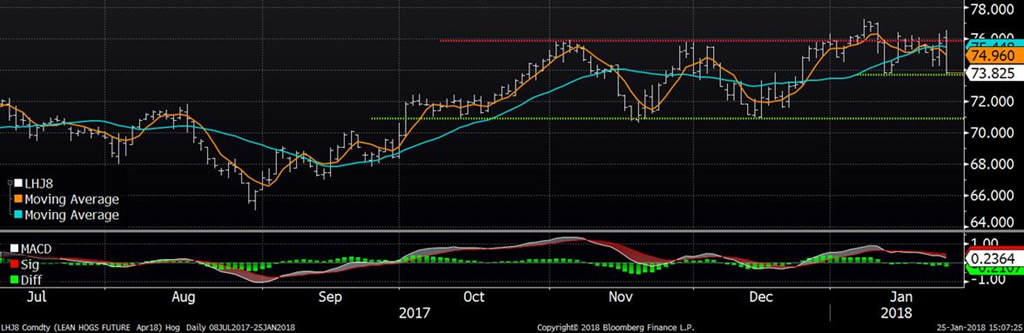 Le prix du porc continue à jouer au yo-yo, retournant dans le bas du dernier mois. Il faut dire que les abattages de mercredi, à 465 000 têtes, rappel au marché l’abondance de viande porcine qui est prévue pour les prochains mois. Cela a aussi pesé sur les prix des découpes d’hier qui baissaient de -1.00 ¢/lb. Le prix repose présentement sur un petit support à 74.00 ¢/lb sur avril, mais si ce support est brisé, une chute jusqu’à 71.00 ¢ deviendrait possible. De plus, les menaces de Trump face à l’ALENA dans son discours à Davos en début d’après-midi remet un spectre sur les relations États-Unis / Mexique qui demeurent très importantes pour la valeur du porc.