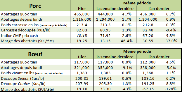 En matinée, le prix du bœuf a atteint son plus haut niveau en 2 mois avec le CàT d’avril qui s’est transigé au-dessus de 126 ¢/lb. Les prix étaient supportés par le prix cash qui ne baissaient pas trop, toujours autour de 122 ¢/lb, ce qui est à rabais comparativement au contrat d’avril, incitant les parcs à retenir les animaux parce qu’ils anticipaient le prix cash de monter ces prochaines semaines. Durant l’encan électronique de ce matin, il n’y a pas eu de transaction, mais les prix offerts par les vendeurs n’étaient pas en dessous de ceux de la semaine dernière.