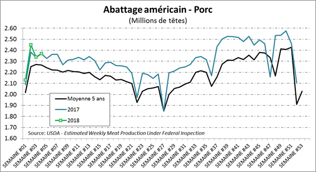 La semaine dernière, les abattages de porc étaient très similaire à la 4ème semaine de 2017, à 2.37 millions têtes. À l’exception de la 2ème semaine, les abattages sont en ligne avec les volumes observés en 2017… l’augmentation de production prévue par l’USDA tarde à apparaître. Le poids carcasse a rebondi au plus haut niveau depuis 1 mois à 213.9 lbs ce qui représente 1lb de plus que l’an dernier et 1.5lb de plus que la moyenne quinquennale. En somme, la production était 0.5% de plus que l’an dernier à 507 millions de livres.