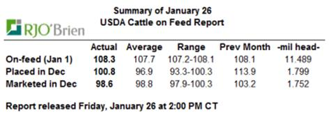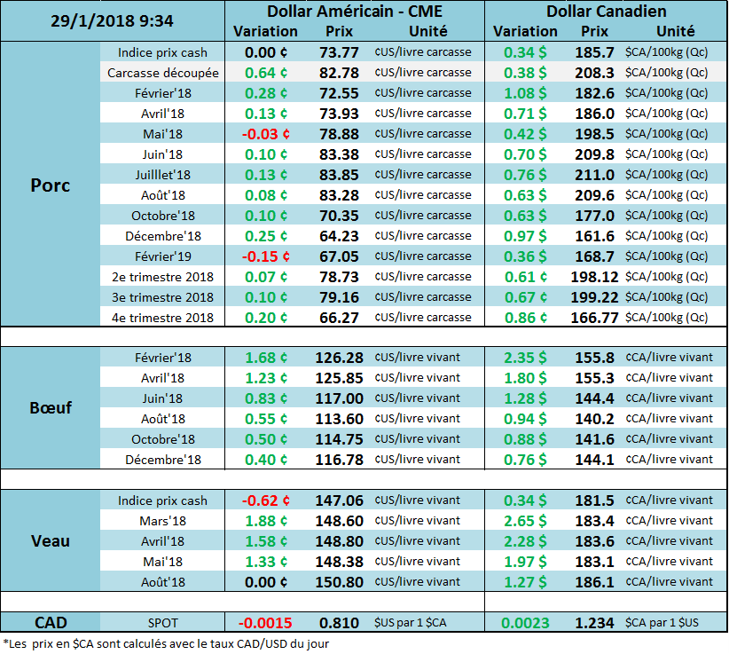 L’USDA a publié le rapport Cattle-on-Feed après la fermeture de vendredi. Le rapport est négatif pour le prix puisque les inventaires de bœufs en parc au 1er janvier étaient 0.5% de plus qu’anticipé à 108.3% du cheptel du 1er janvier 2017, à 11.49 millions têtes. La fourchette des estimés était de 107.2% à 108.1%, le résultat est donc au-dessus des prévisions de tous les analystes. Alors que les analystes prévoyaient un recul des placements en raison du fort volume à l’automne dernier, les placements de décembre continuent d’être plus élevés que l’an dernier, par 0.8%, comparativement à la fourchette des prévisions de -6.7% à +0.3%. Concernant les sorties des parcs, c’est en ligne avec les prévisions, en baisse de 1.4% versus décembre 2016. À la lumière des derniers rapports, on note qu’il y aura une forte production vers les mois d’avril et juin étant donné la somme des placements des 3 derniers mois est 12.4% plus élevé que l’an dernier, alors que le nombre de bœufs qui sont en parc depuis plus de 90 jours est en croissance de seulement 2.8% ce qui devrait être neutre pour le prix de février.