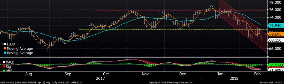 Le prix du porc avait commencé la semaine dernière avec un petit rebond suite à une prise de profit et des anticipations d’une demande plus forte en raison du prix des découpes qui avait remonté, améliorant la marge des abattoirs. Cependant, le rallie s’est estompé en milieu de semaine et les prix se sont effondrés sous les appréhensions d’une offre abondante qui fait reculer le prix cash. Le contrat le plus rapproché (avril) est à son plus bas niveau depuis 4 ½ mois, tout juste au-dessus de 68 ¢/lb comparativement à 76 ¢/lb il y a un mois. Techniquement, le renversement observé jeudi-vendredi ouvre la porte pour une continuation de la baisse du prix. De plus, le contrat d’avril est 4.5 ¢/lb en-dessous du prix cash ce qui démontre le pessimiste du marché quant aux prix des prochaines semaines. D’ailleurs, le prix cash entame sa descente printanière plus tôt que l’an dernier avec des baisses de 0.5 ¢/lb lors des 3 dernières publications de la semaine dernière et s'accélérait à -0.93 ¢ hier, ce qui laisse croire que le sommet du 7 février à 75.6 ¢/lb ne sera pas surpassé avant quelques mois.