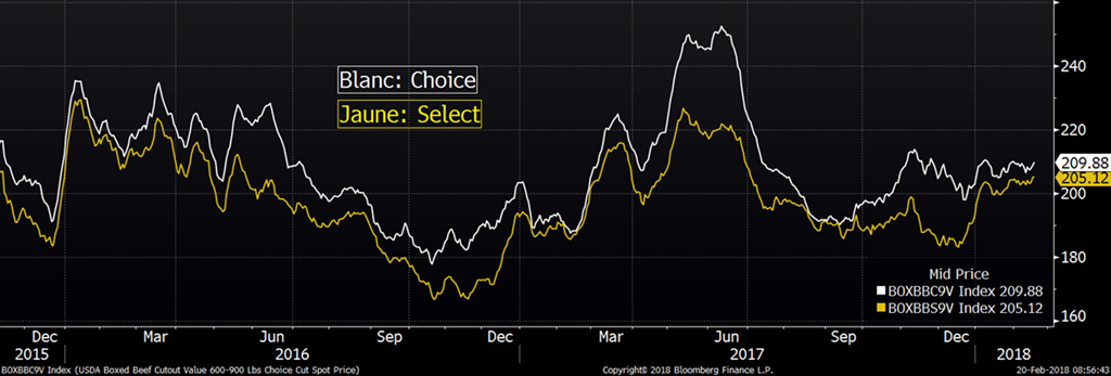 Le prix du boeuf a terminé la semaine dernière en force avec un nouveau sommet sur le prix d'avril depuis la mi-novembre. De plus, le prix du contrat d'avril a percé la résistance ce qui ouvre la porte jusqu'au prochain sommet à 130 ¢/lb. C'est le sentiment de voir une demande plus robuste qui supporte le prix. D'une part, le prix des découpes remontent avec le Selectà 205 ¢/lb, un sommet en 7.5 mois, alors que le Choice retourne près du haut des derniers mois à 210 ¢/lb. D'autre part, la marge des abattoirs s'améliore ce qui laisse présager que les abattoirs pourront enchérir sur leur mise puisqu'il y avait peu de transaction la semaine dernière étant donnée que les parcs d'engraissement demandaient 130-132 ¢/lb. Toutefois, la marge des abattoirs demeure négative à -3$US ce qui est tout de même mieux que la semaine dernière à -25$US/tête et l'an dernier à -60$US/tête.